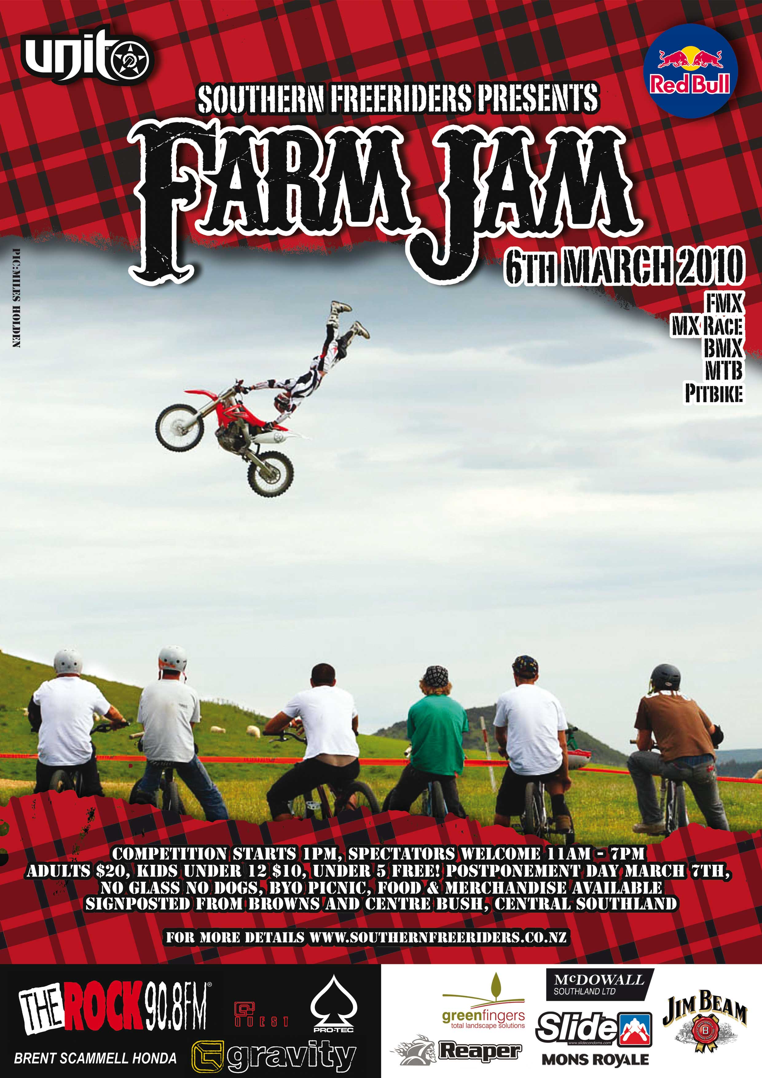 Farm Jam is organised, captured, ridden, and judged by the riders. Its a huge collaboration of of the Freestyle Bike Industry from around Australasia, and March 6 2010 is going to showcase everything that is the Southern Freeriders.