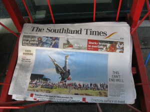 Front page of The Southland Times on Monday 8th March. Brian the Bastard losing it on a flip whip. Later he won Best Trick (rider judged and was overall best trick from FMX, MTB and BMX) by pulling a front flip off the flat wooden drop on the Big Line. Nuts.