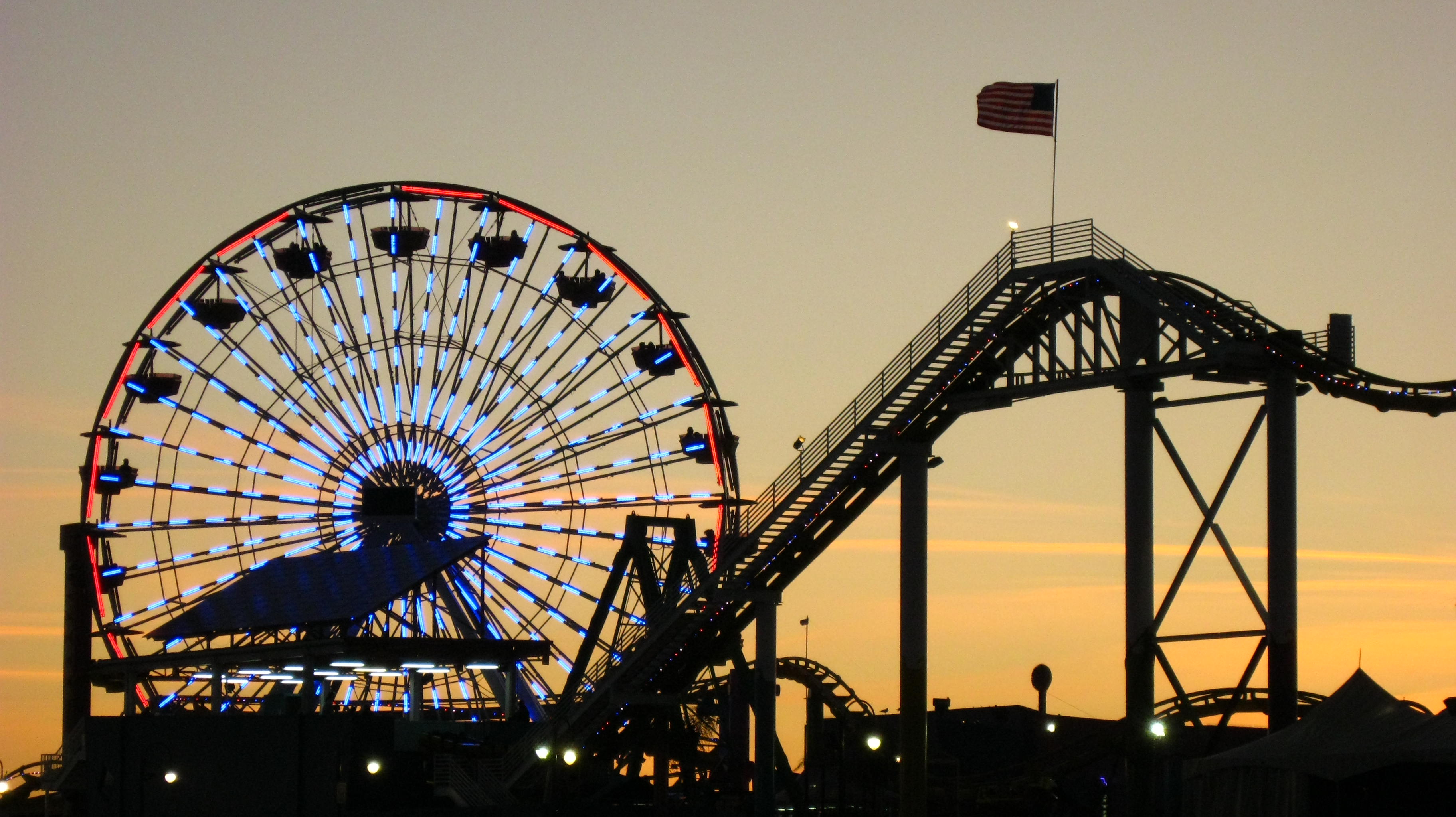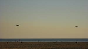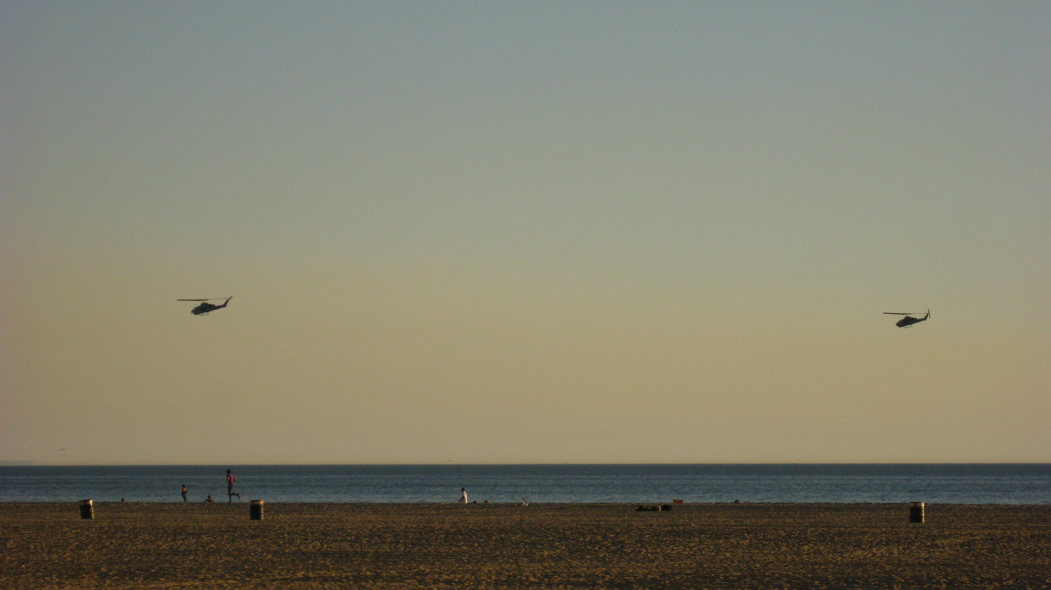 Venice Beach. Two US Apache helicopters fly along the beach at sunset. Why? Well the freakshow that is Venice Beach/Santa Monica probably does worry the powers that be into having gunship patrols there. It's something else. Like a strolling, roller-booting, cruising, swaying montage of all the things that is 2Girls1Cup about the States.