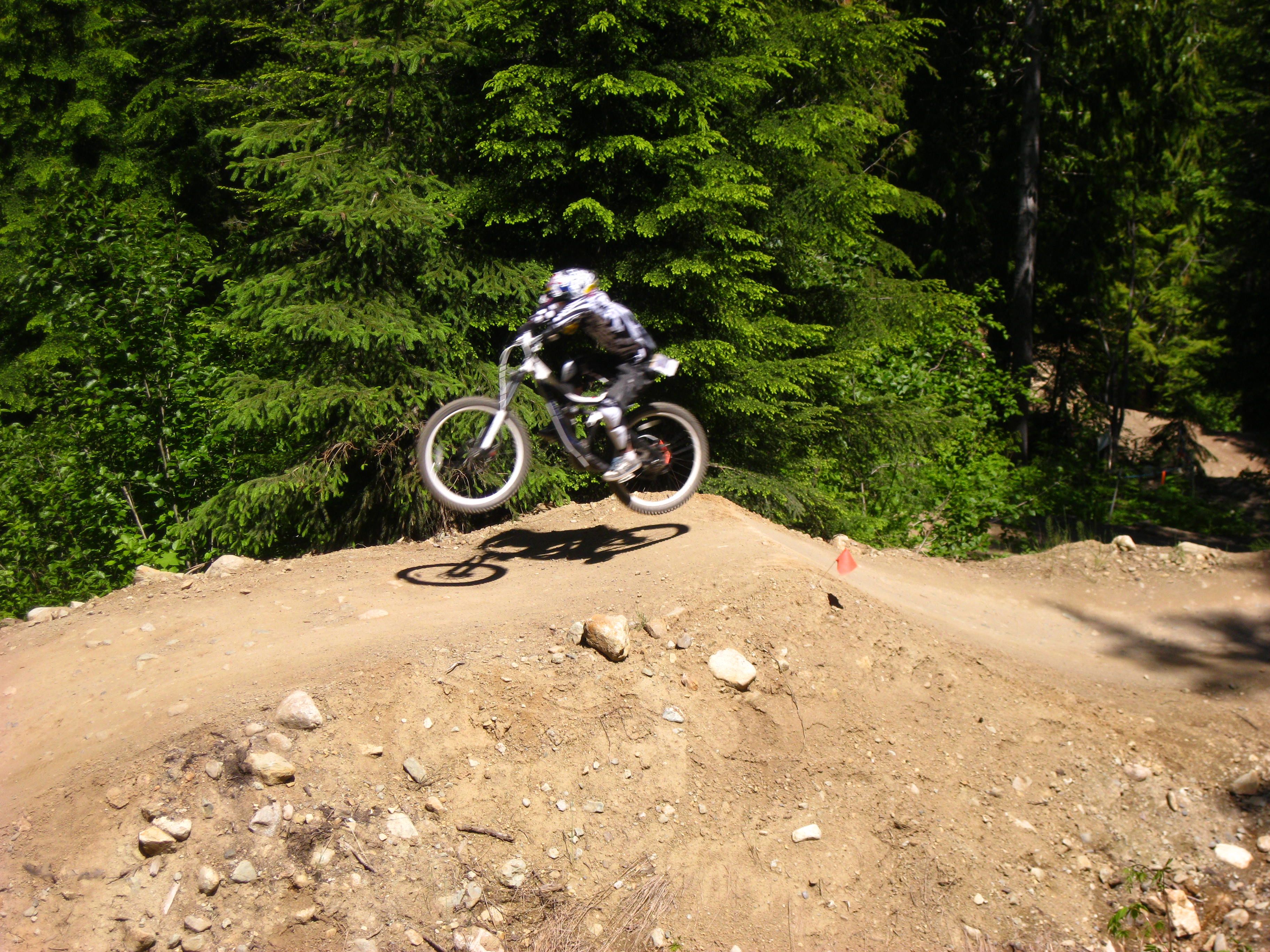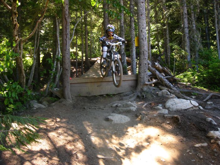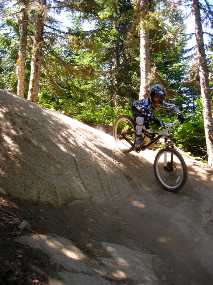This is Ian. Ian is nine years old. Ian likes to mountain bike. Ian can ride Crank It Up, A-Line, and Dirt Merchant. Here is a photo of Ian dropping into Dirt Merchant.