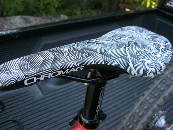 Chromag Moon seat with limited edition CoC (Camp of Champions) design. So comfy and sleek that it was a fight between the Driver and the Tallboy as to which bike it went on. The Driver got the Tallboy in a gnarly nipple cripple. Dirty fighting is to be expected when you have a seat that looks and feels so good on your anus. It’s got a funky curve to take pressure off the man balls part, which also works great when it is in prime DH ‘performance’ angle. The Moon saddle comes out in the fall or winter.