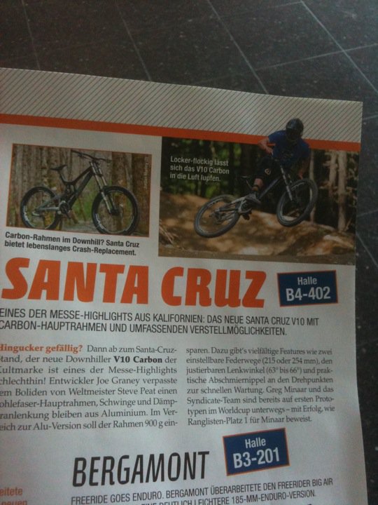 This was sent to me by John Oldale from the Eurobike Guide. Boom! Still big in Germany after my appearance in German Womens Health Magazine last year. The caption with the photo is translated as “How did this technology adverse weener schnitzel get hold of a Carbon V-1o?”