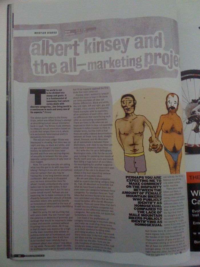 Starting from the front, Whistler Diaries - Albert Kinsey and the All-Marketing project. It talks about gay issues in mountain biking and how that relates to the increasing spectrum of bike categories...you'll have to read it to make sense of it, maybe it still won't. As usual Jon Gregory kills it with the illustration.