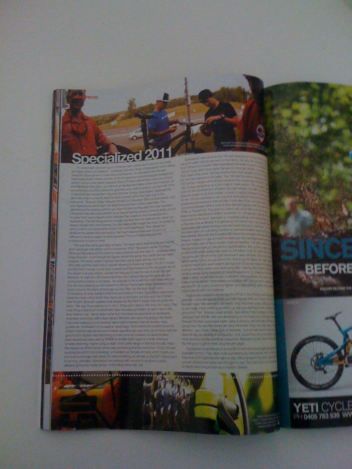 One pager on Specialized Demo 2011. I was fortunate enough to shred some laps with Buckley and Sloan from Specialized (they rip!!!) and then sit them down for a natter about the bikes, the scurge of internet pirates, and taking down the young lads in the office. Good blokes, and did I say they were fast?