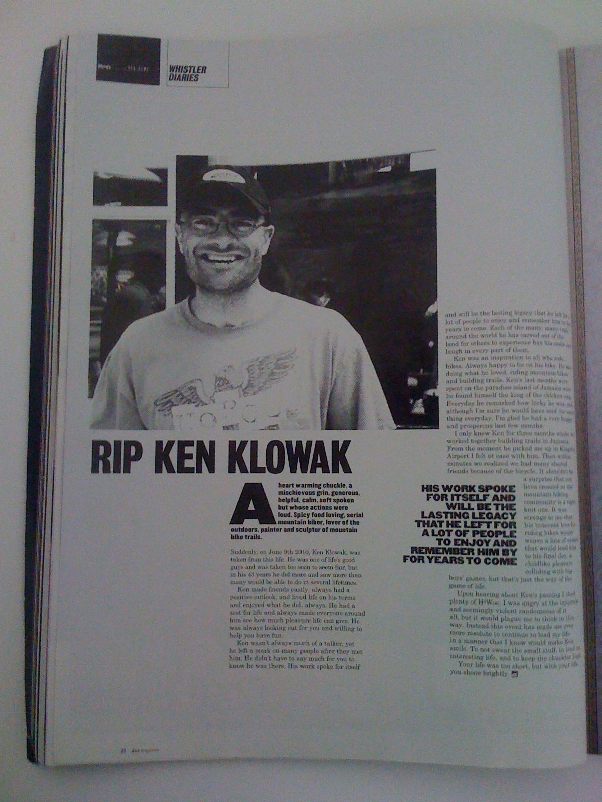 The Whistler Diaries that issue is a memorial to our fallen friend Ken Klowak who was killed in June. Rest in peace Ken, you'll need your energy for the trails wherever you are.