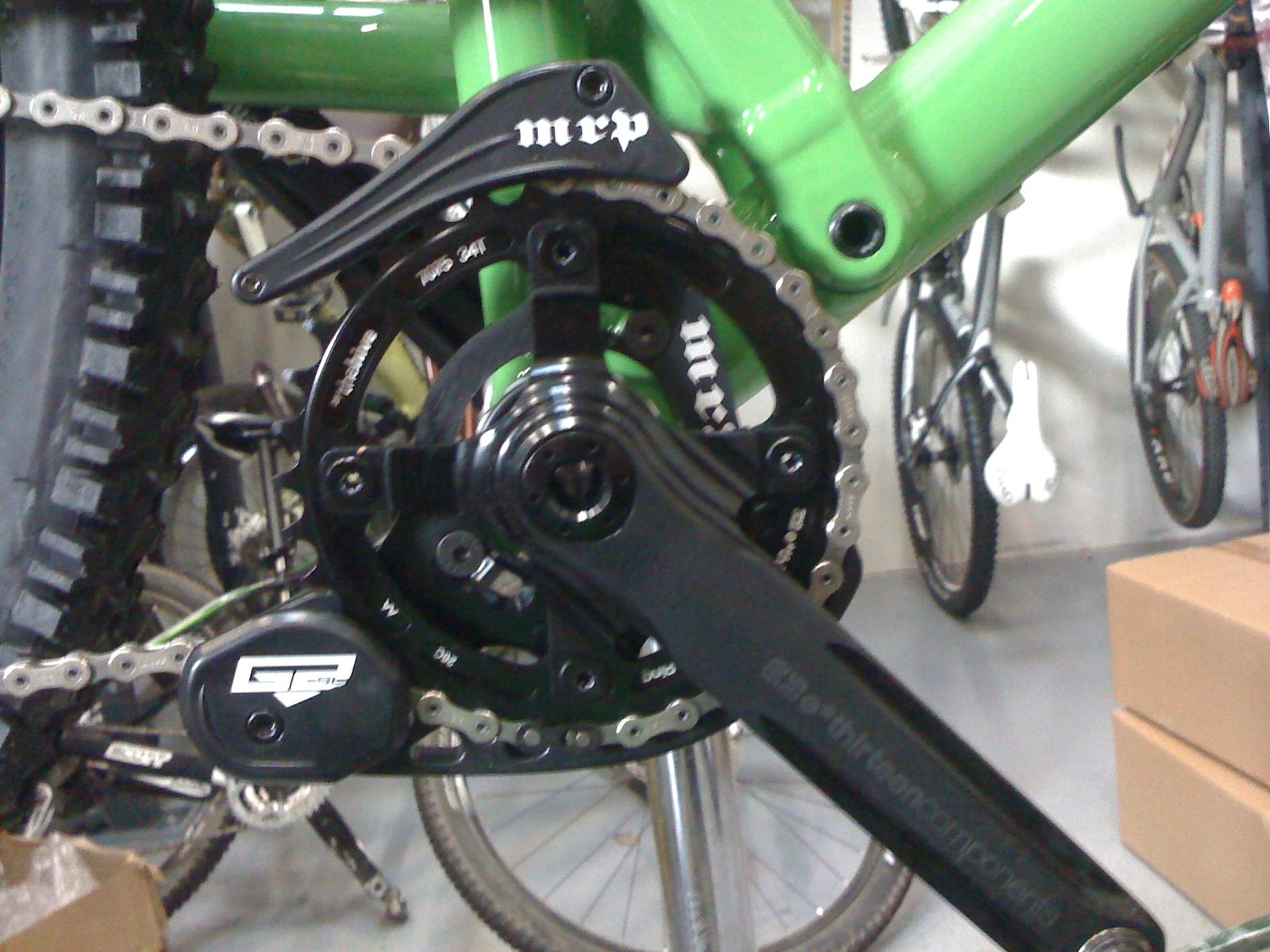E-Thirteen Single Speed cranks were a pleasant surprise. I had no idea they were coming. Looking forward to smashing the bearings in these as a test. I ran the DH versions all summer on the V-10 and had no problems, but the test comes now when I'm in the muck and turning them incessintly. MRP guide seems a little off considering E-Thirteen cranks but it is a very good guide. 34 teeth up front, silent downhill, never a slipped gear up front now, and now if I want to make that climb I have to push hard on the thighs rather than be a pussy. I may never go back to double ring...until I test out the single on a eight hour Chilcotins mission. I'll let you know.