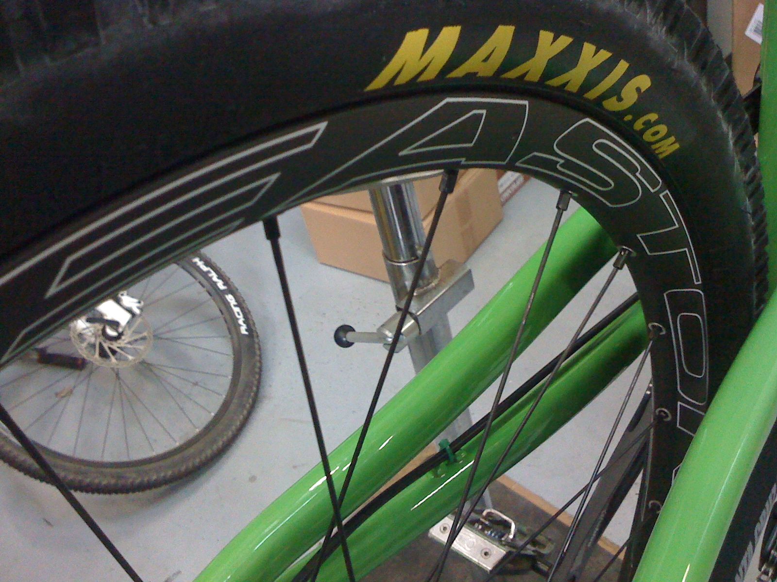 Lovely plastic hula hoops. Tires were a choice at first. Started High Roller single-plyfront and rear, but they were too slow rolling on the rear (I felt like I was riding through the contents of Lady Gagas underpants), and after twelve months on the Ardent up front on my pedally bike, I missed the predictable drift and catch. So I went to 2.4 Ardent up front and Cross Mark on the rear. Seems a little wafer on the rear but I like the lack of rolling resistance so far. Note the green, almost matching, zip ties for the cables. I didn't go looking for green ties, they were just there asking to be put on I promise.