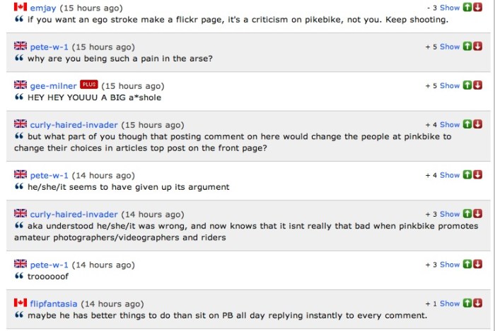 2. You write from the heart Seb, a rare trait. I always enjoy reading your work, you don’t write in shades, it’s black and with you and there really isn’t enough of that sort of thing. With that said, I think that it’s unfair to single out Pinkbyke. What is ANY other site doing better? I can go to any of the popular websites right now and see nothing but the same filler: press releases, uninspired content, and front page news that are simply forum posts. What we’re seeing is these websites putting up content for the sake of putting up content. You call out Pinkbyke for the inane comments, but have you checked out any other site that allows users to comment on posts and has the same following? Fuck me, try reading the comments on anything from CNN, Time, to VBS ect, and those are supposedly more grownup and “readed” users. I don’t think for a minute that the comments would be any better on any other site. At this point in time every single cycling website is terrible and basically needs to be flushed down the shitter, the lot of them! Fuck I sound emo. Thoughts?