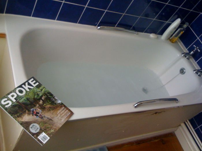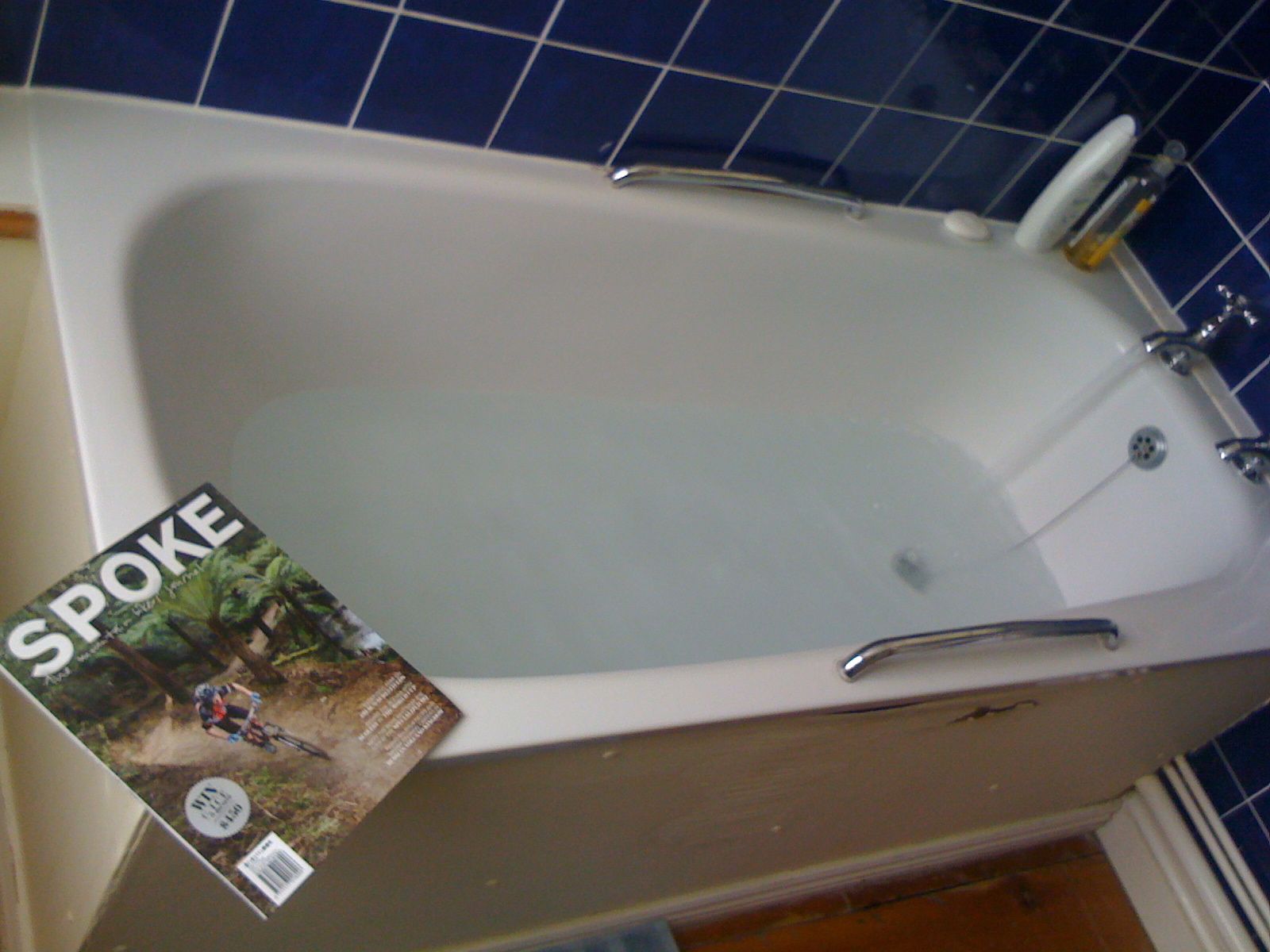 I haven't had a bath in years but at my fathers cottage that is all he has. It's nice to relax with a good book (or a great issue of Spoke Magazine), but baths do not get you clean. It's like bathing in your own dirt and they take so long.