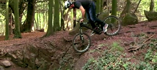 Weight back? Really? So he is expecting people to hang off the back of their bikes as they go off the drop? Just consider what this might do to the bike. What he is trying to say (and I say this because looking at the video it is exactly what his body is doing even if his mouth isn’t communicating it) is that you should be pushing the bike FORWARDS. Yes, that is right, forwards. That way it is accelerating the bike in relation to the body. You don’t need to go fast, you need to be able to forcefully and positively accelerate the bike in front of you. This will stop what Martyn talks about when he says, “You get the front up but you haven’t got the pace to hold it up and it drops and you have this steep drop onto the front wheel.”