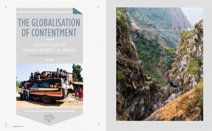 As well as the short essay, Peak Travel, we “blogged” about the other day, 2FLAT’s Seb Kemp also has a story about Nepal in the latest issue of Spoke Magazine. Except it isn’t the usual travel story or adventure tale, but rather a musing on our modern world in a time of global homogeneity, credit card exploration and tailored tours. He asks the question, is there anymore world to explore and whether we all actually need to feel the cliffhanger fear of true adventure.