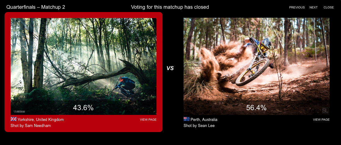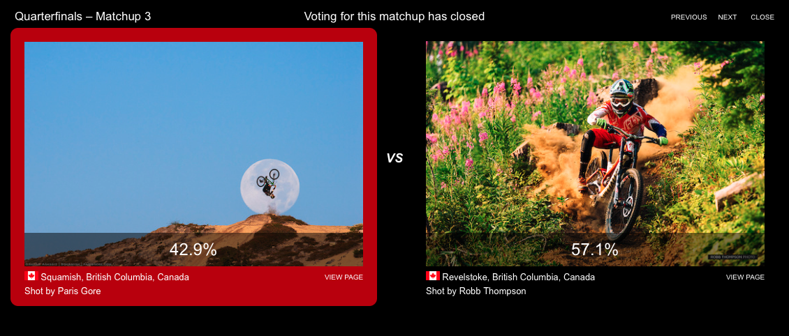 So it’s that time of the year when Pinkbike holds it’s POTY (Photo Of The Year) competition. 32 of the top photos (I’m assuming that means most viewed) from 2014 go into the octagon and battle it out in a round robin style death match that will see just one image crowned the very, absolute, total bestest. Of course, each victory and defeat is decided by the people that vote on each round, which means the feckless proles like you and I…and him and her. Now, this leads to all sorts of interesting match-ups and results.